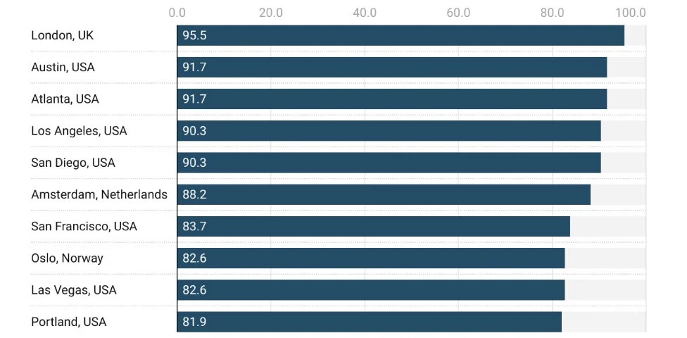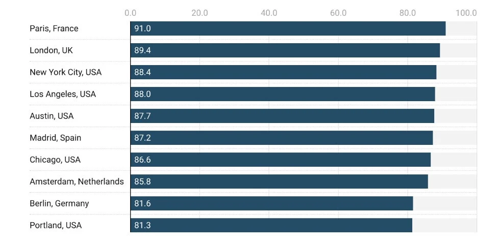 While Paris doesn’t score highest on any particular tech and connectivity metric, it scores steadily above average in most of them, meaning its well-rounded score puts it top of this category of our index.