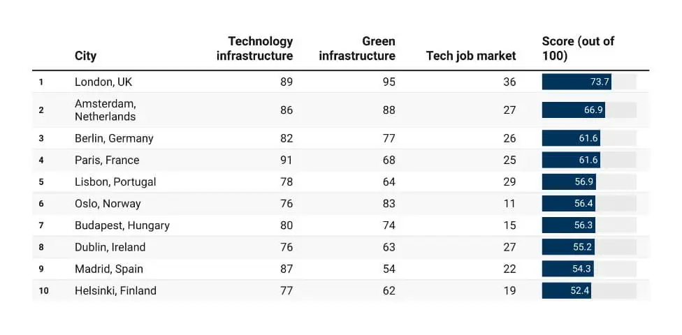 10 cities with the highest ranking tech job market for a smart city future across Europe and USA