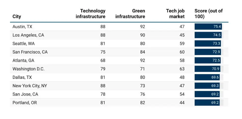 Based on 11 metrics, divided into three categories (tech infrastructure, green infrastructure, tech jobs market) equally weighted with a score out of 100, and combined towards one total score out of 100