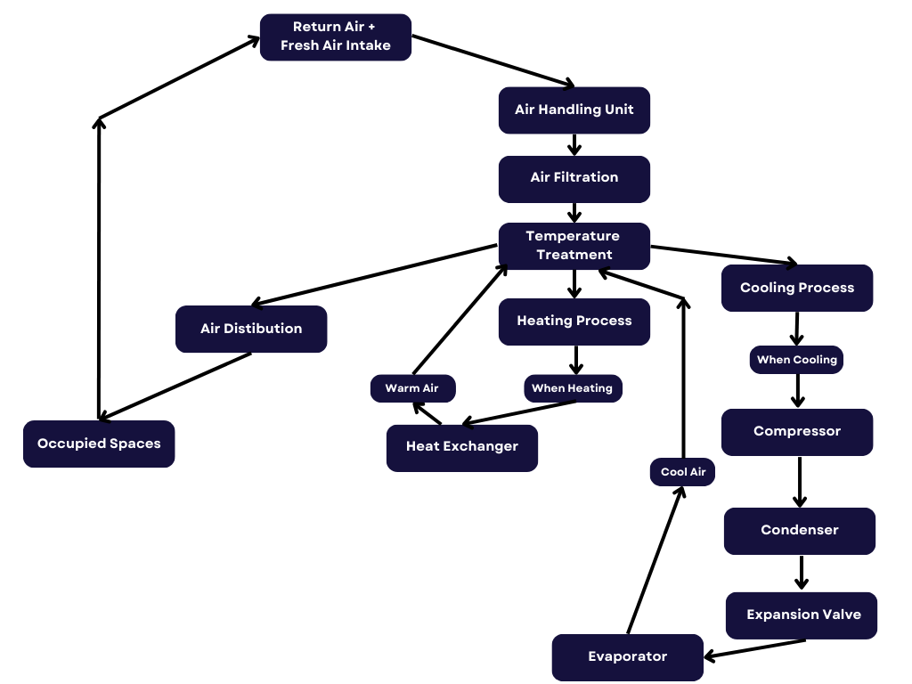 Commercial HVAC systems operate through a sophisticated network of components working in harmony to maintain optimal indoor conditions. Here’s a basic flowchart for the operation of a commercial HVAC system: