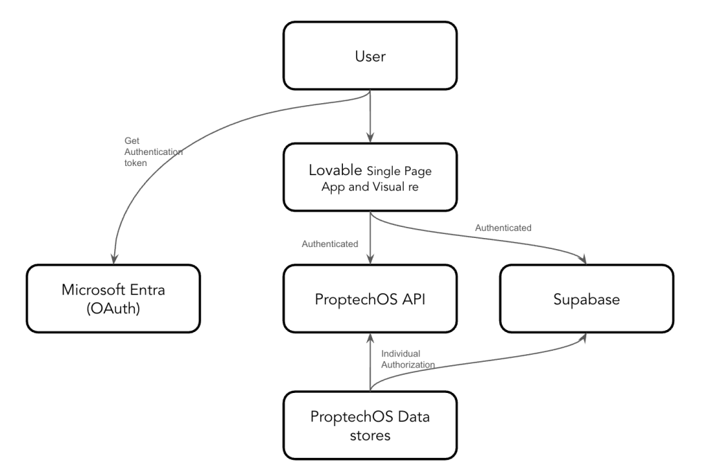 - App Display and Interaction: The Lovable front-end (which runs in the user’s browser) combines data from ProptechOS APIs and Supabase queries to present a unified interface. For instance, a dashboard might show live sensor stats from ProptechOS (via API) alongside historical trends stored in Supabase. All of this occurs without exposing any direct database connections or secrets to the user; the app uses either the user’s Azure AD token or the Supabase user token to mediate every request.