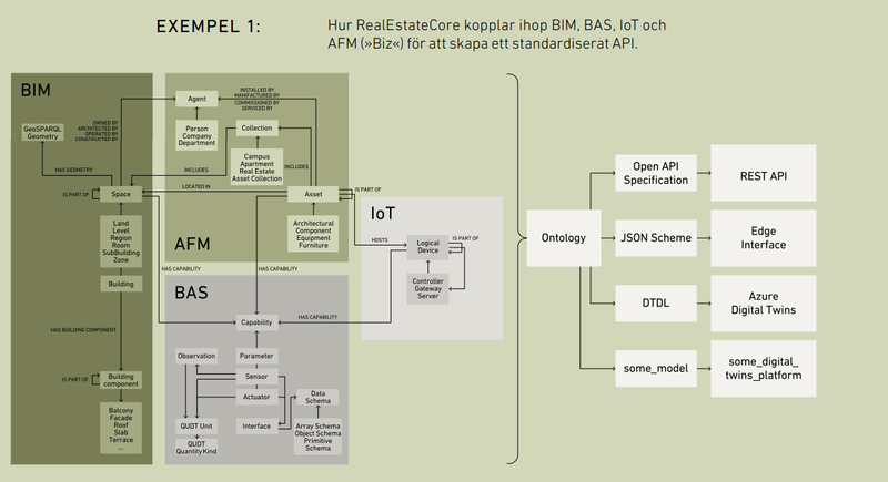 Example 1: How RealEstateCore connects with BIM, BAS, IoT, and AFM (Biz) to create a standardized API.