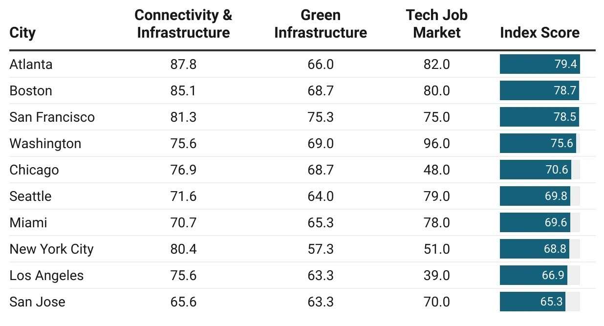 While Atlanta steals the top spot for its superior performance in the technology infrastructure and connectivity category, Boston is also performing well in this area for 2025.