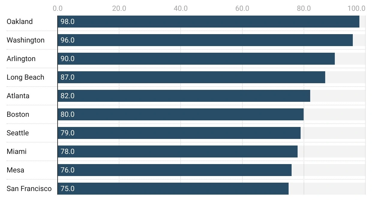 Oakland outperforms all of its neighbouring Californian cities this year for offering the greatest choice of tech jobs relative to its population size — scoring 98 out of 100 overall in the tech jobs category.