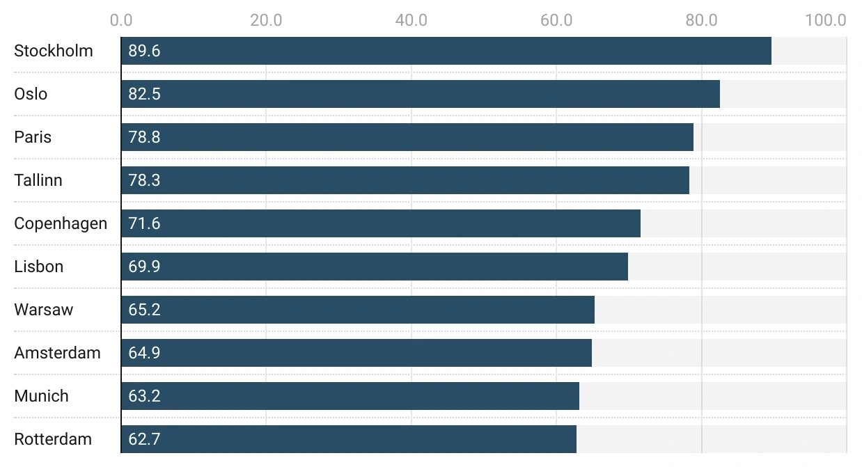 Ranking second behind Amsterdam on its rate of EV chargers per 100,000 people (73), it is also the fifth-best city for its level of air pollution. Its tree loss over more than two decades is the 11th lowest for any European city analysed — equivalent to 76 hectares – while it has created an additional 333 hectares of tree coverage over a similar period.