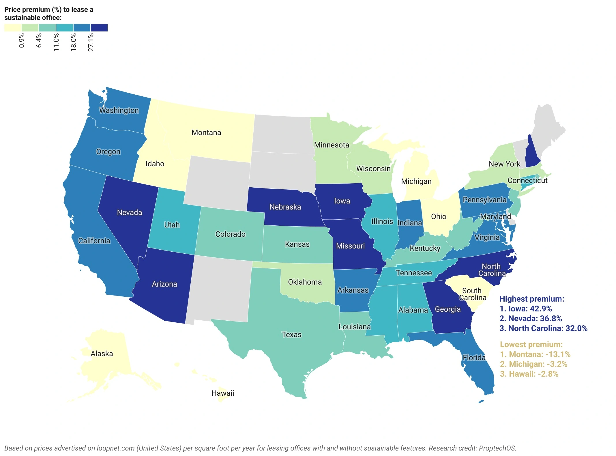 Leasing sustainable offices in Iowa means paying the biggest difference (+42.9%) relative to the average price of non-sustainable offices in that state.